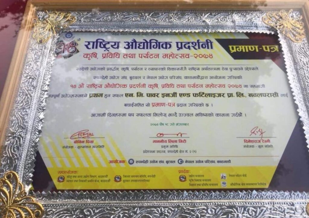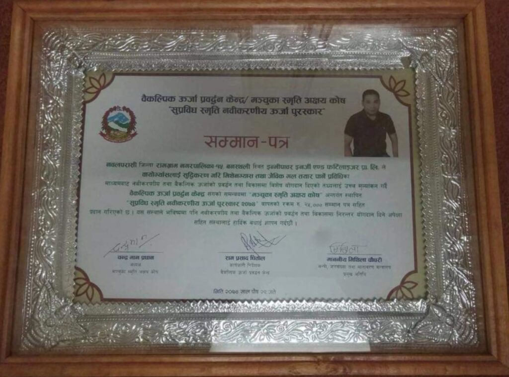 Awarded With Best RENEWABLE ENERGY PROJECT 2074 of Nepal